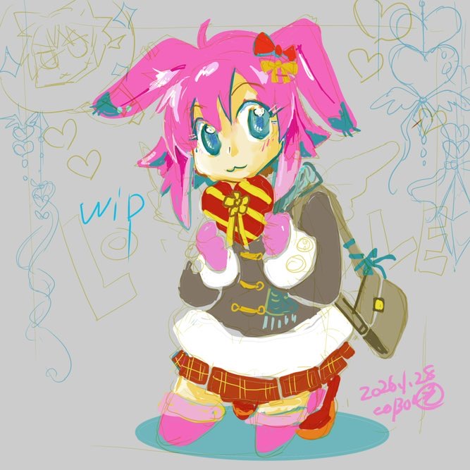 index絵が9月に描いたやつだと気がつきindex絵になるかわからないけど変更したくてバレンタイン絵とかラフ描きながら、女装男子✕青年漫画進めてる。